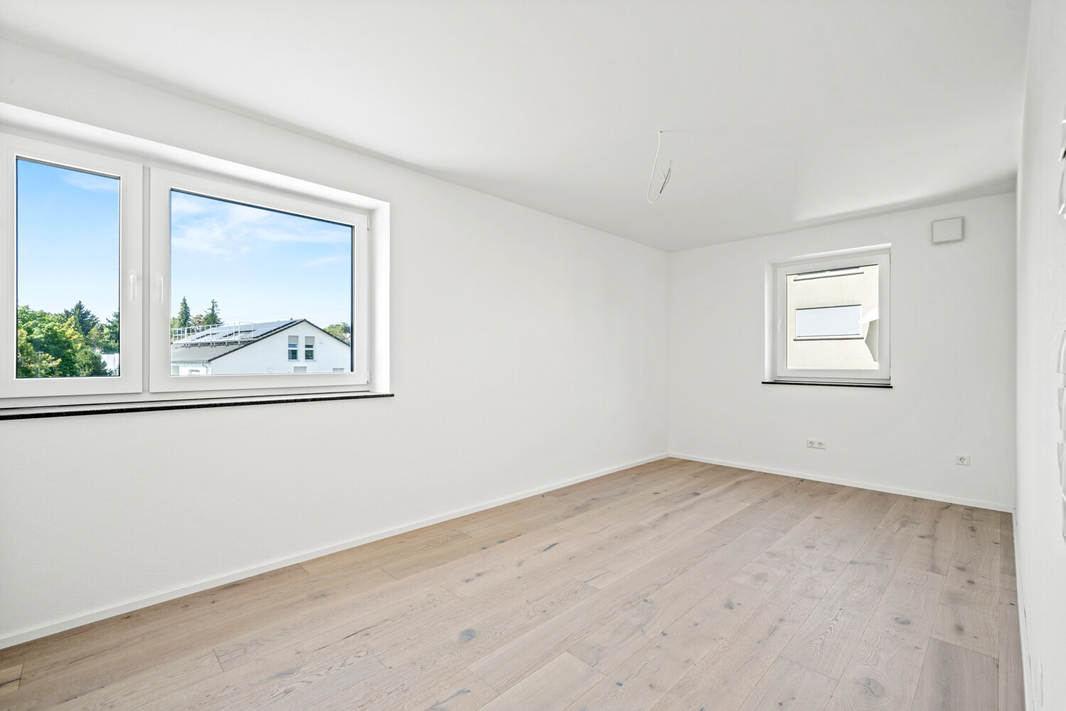Die Ausstattung entspricht dem KfW-55-Standard und kombiniert Nachhaltigkeit mit Wohnkomfort. Eine Wärmepumpe, Photovoltaikanlage, Fußbodenheizung und eine dezentrale Lüftung mit Wärmerückgewinnung sorgen für niedrige Betriebskosten und ein angenehmes Raumklima. Hochwertige Materialien wie Eichenparkett, moderne Sanitärobjekte und bodentiefe Fenster runden den hochwertigen Eindruck ab.