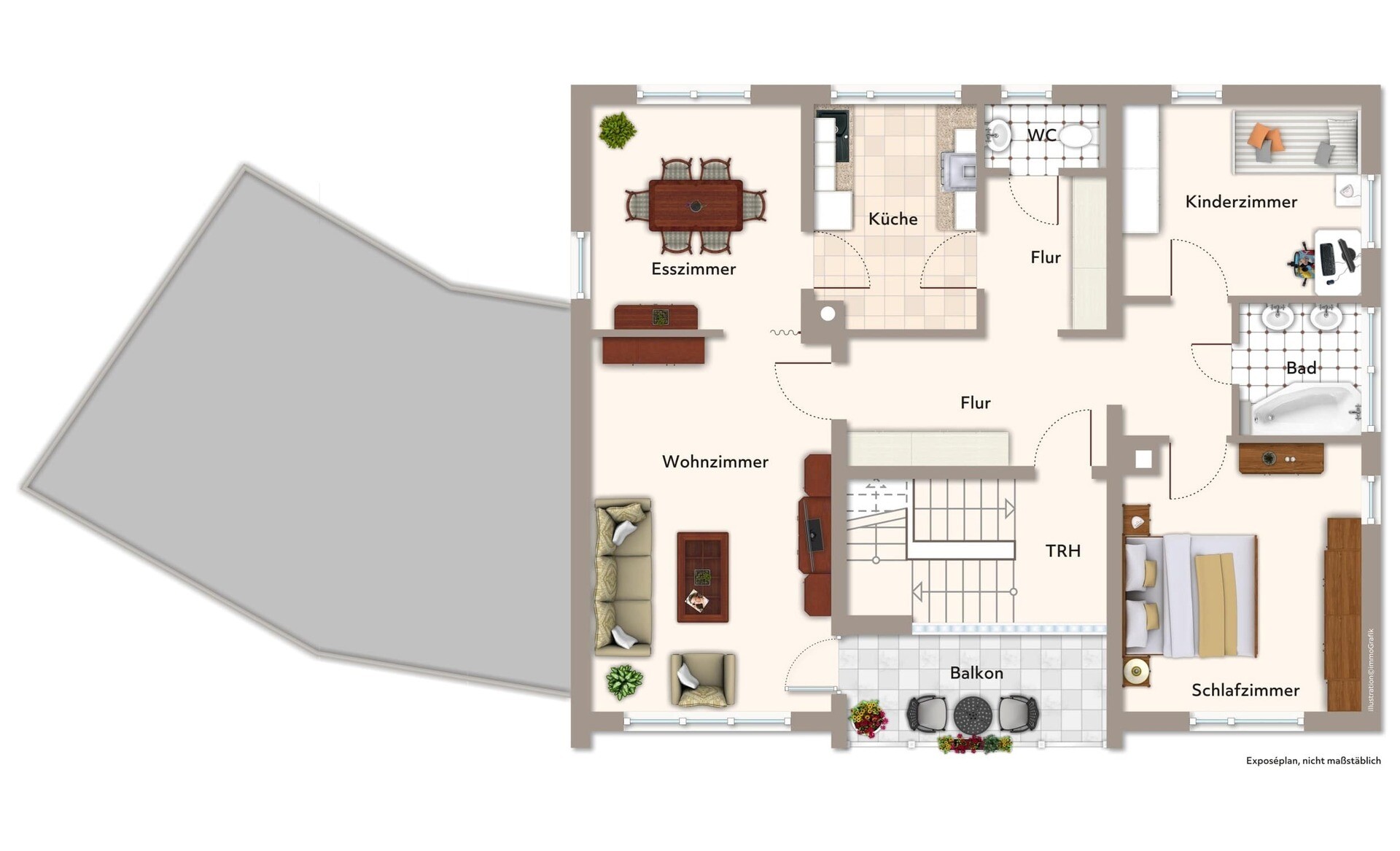 Wohn- und Esszimmer mit Zugang auf den Balkon (West-Ausrichtung), Schlafzimmer, Tageslichtbad ausgestattet mit Wanne, WC und Waschbecken.