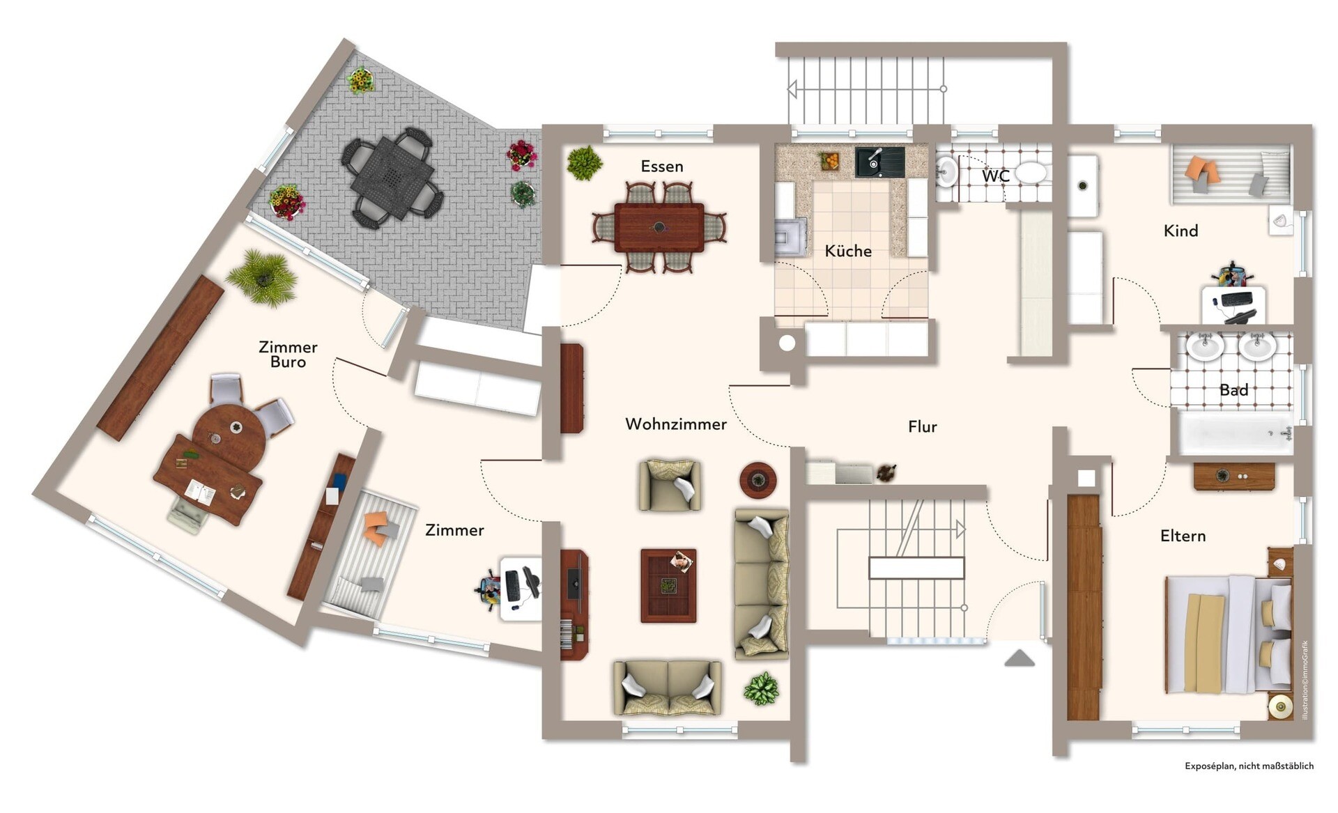 großes Wohn- und Esszimmer mit Zugang auf den überdachten Freisitz, Küche, Schlafzimmer sowie drei weitere Zimmer individuell nutzbar, Tageslichtbad mit Wanne und zwei Waschbecken, Toilette separat