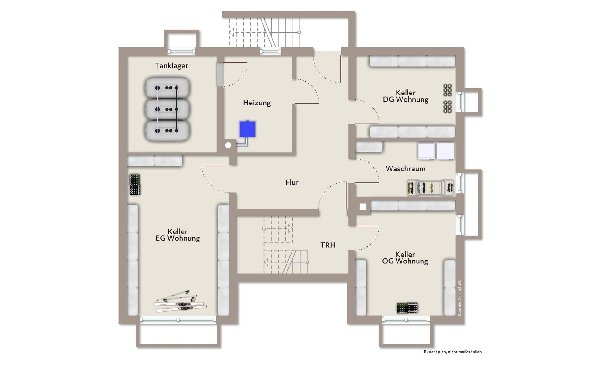 Jede Einheit verfügt über ein eigenes Kellerabteil im Untergeschoss, zudem steht den Bewohnern eine gemeinschaftliche Waschküche zur Verfügung. Eine Garage mit Platz für drei Fahrzeuge sowie ein gepflegter Garten komplettieren das Angebot.