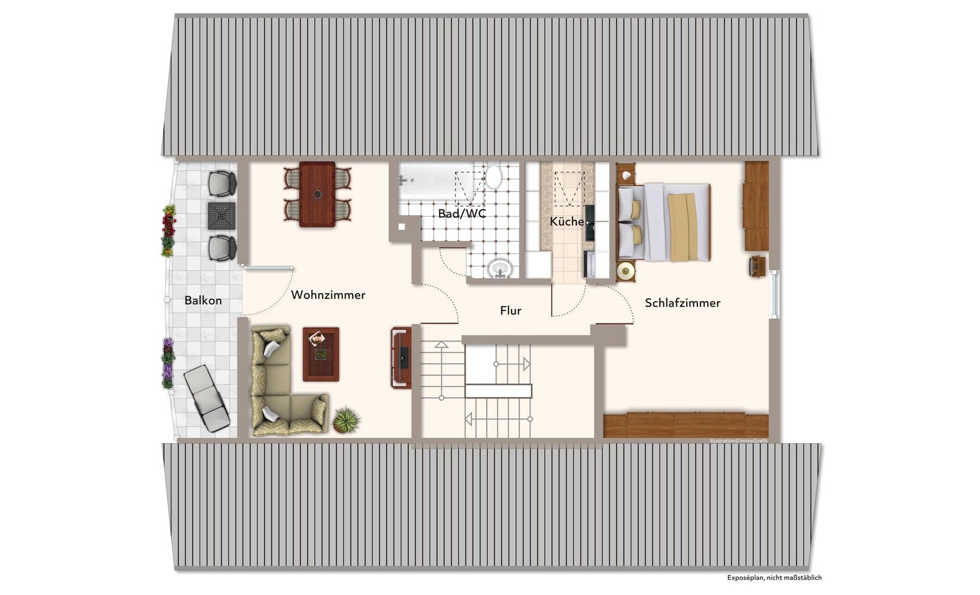 Im Dachgeschoss rundet eine gemütliche 2-Zimmer-Einliegerwohnung mit rund 35 m² ausgebauter Nutzfläche und einem kleinen Balkon das Raumangebot ab.