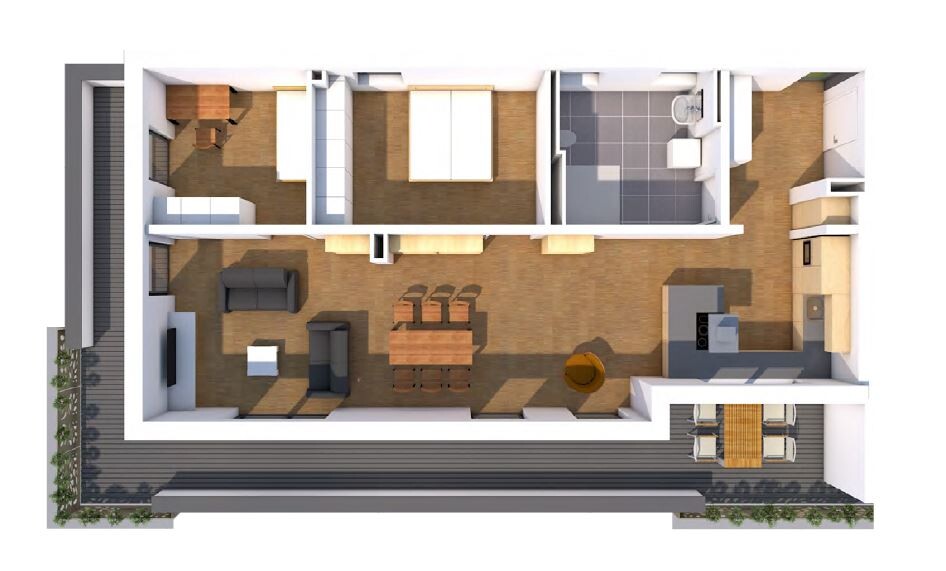 Das absolute Highlight ist die beeindruckende, umlaufende Dachterrasse mit über 40 m² Fläche. Sie öffnet sich direkt vom großzügigen Wohn-, Ess- und Kochbereich und bietet einen herrlichen Ausblick, viel Sonne und Raum für entspannte Stunden im Freien – ob zum Lesen, Gärtnern oder einfach zum Genießen.