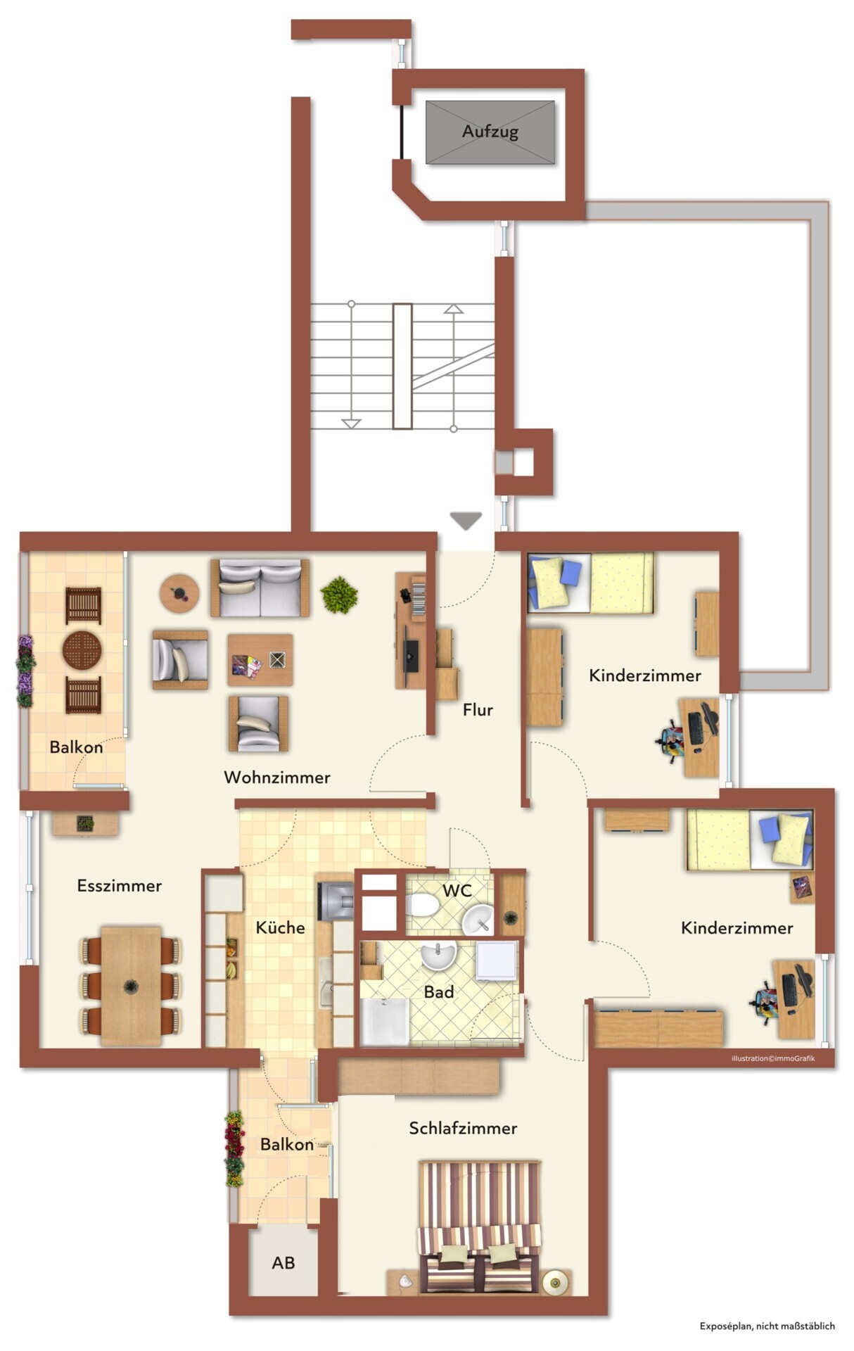 Diese attraktive 4,5-Zimmer-Wohnung im 2. Obergeschoss eines gepflegten Mehrfamilienhauses bietet Ihnen auf großzügiger Wohnfläche vielfältige Nutzungsmöglichkeiten. Das Esszimmer kann problemlos zu einem dritten Kinderzimmer umgestaltet werden und schafft somit zusätzlichen Raum für Ihre Familie. Ein Aufzug im Haus sorgt für bequemen Zugang zur Wohnung.