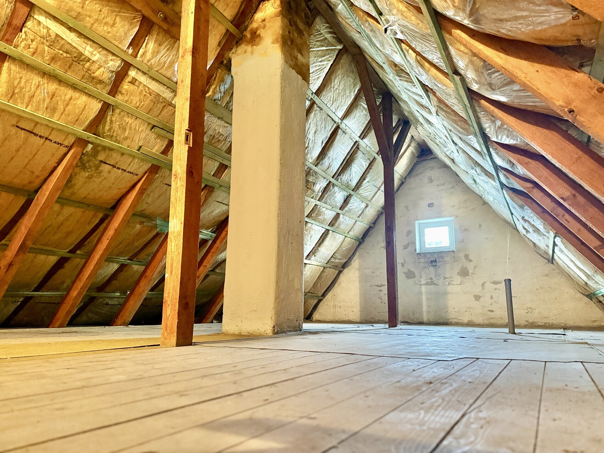 Ein besonderes Plus ist das 2007 erneuerte und isolierte Dach, das zusätzlichen Ausbauplatz bietet. Das bisher unausgebaute Dachgeschoss eignet sich ideal für eine Galerie, ein Atelier oder einen weiteren Wohnbereich.