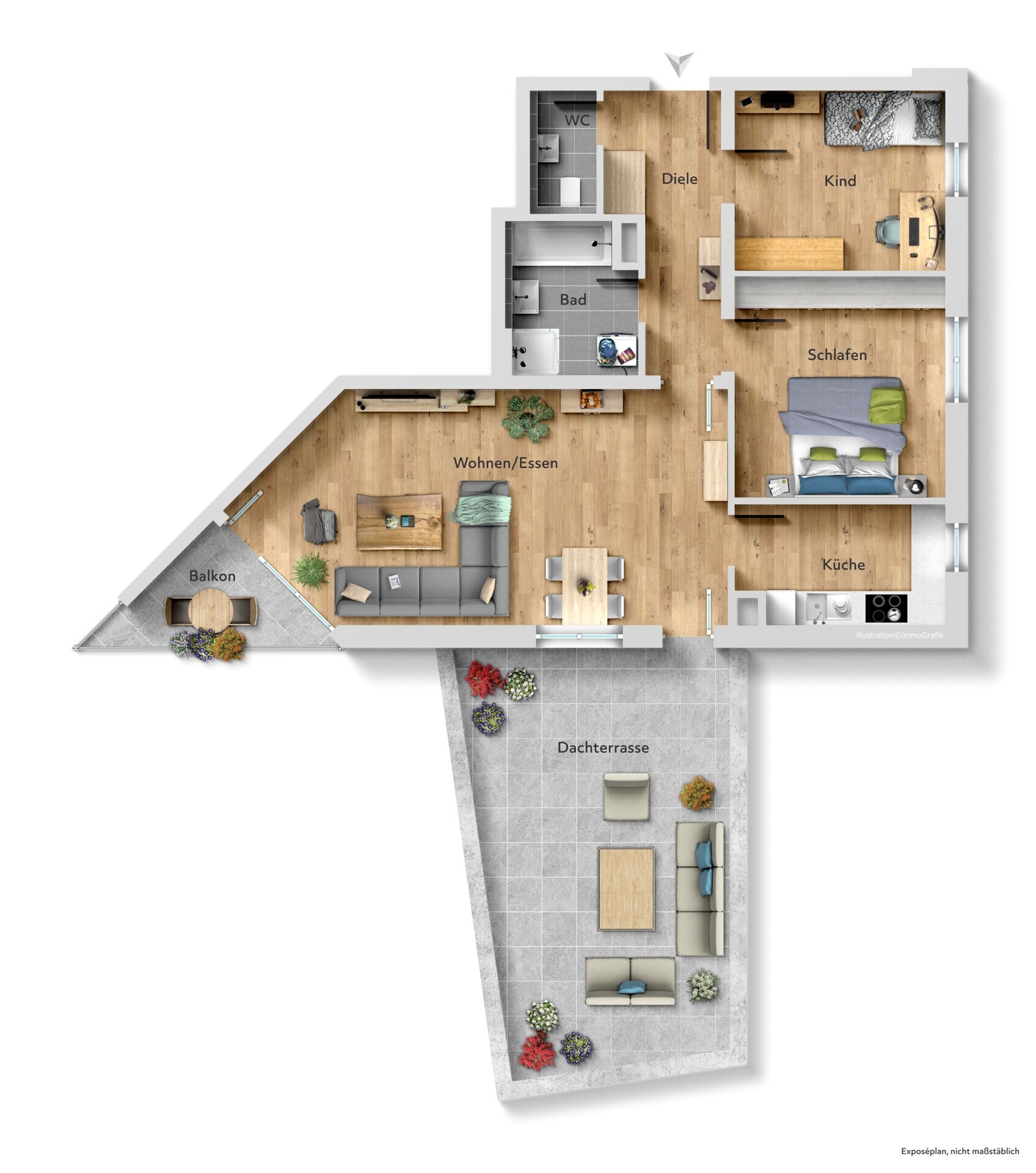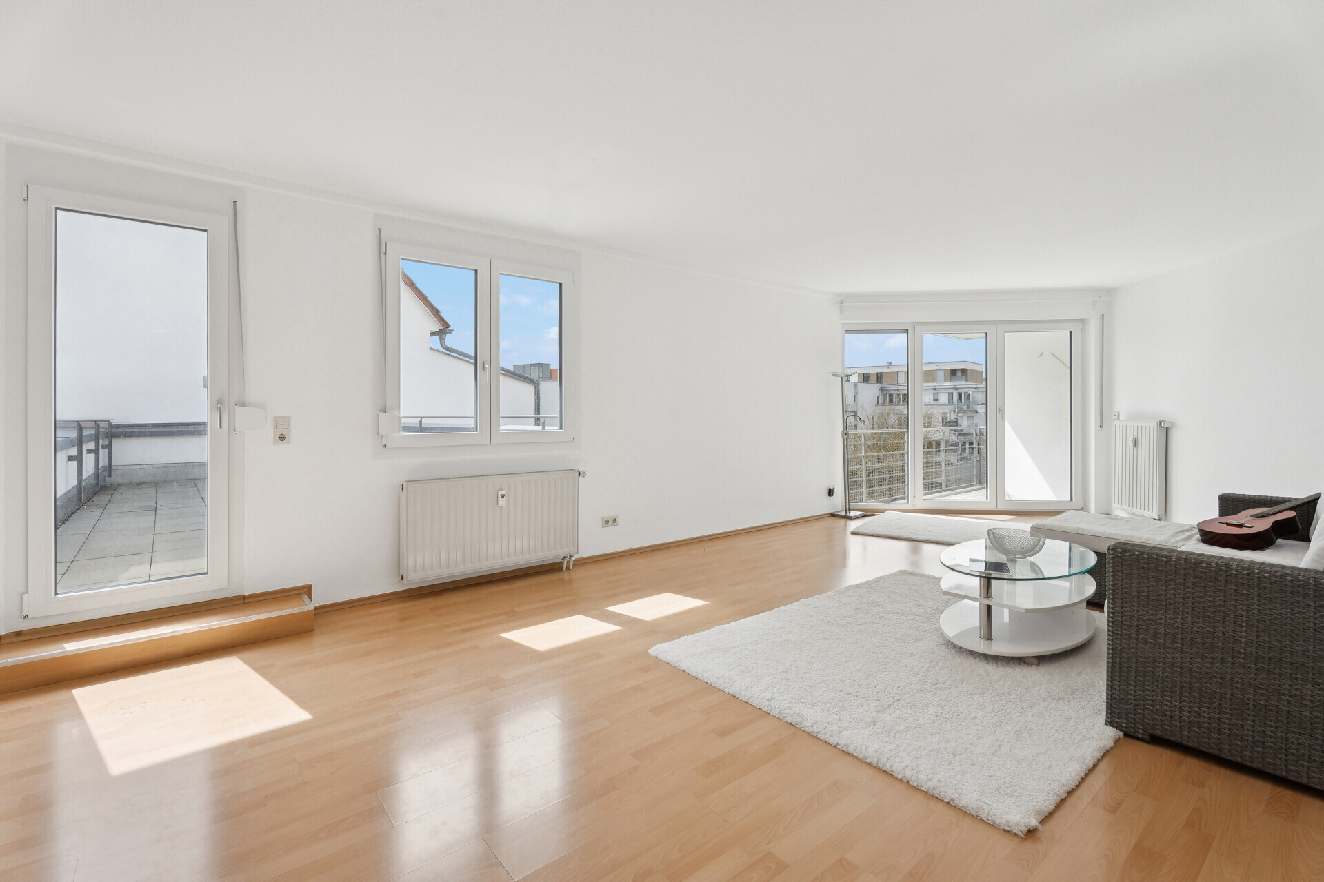 Ein ganz besonderes Highlight erwartet Sie im Außenbereich: Die großzügige Dachterrasse wird schnell zu Ihrem persönlichen Lieblingsplatz – sei es für entspannte Stunden in der Sonne, gesellige Abende oder einfach, um den Blick schweifen zu lassen. Der zusätzliche Südbalkon schenkt Ihnen noch mehr Raum für Erholung unter freiem Himmel.