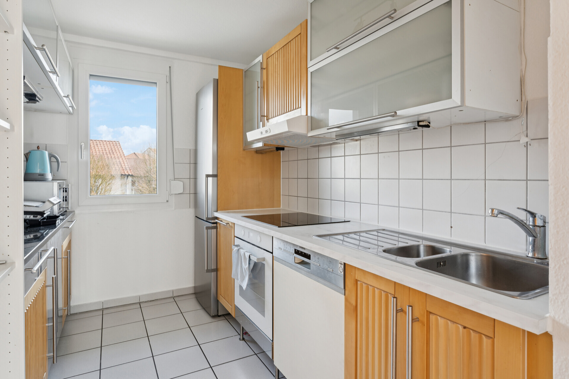 Der großzügige Wohnbereich lädt zum Entspannen und Zusammensein ein, während die angrenzende, separate Küche Raum für genussvolle Momente bietet. Das zeitlos gestaltete Badezimmer mit Wanne und Dusche wird ergänzt durch ein separates WC – praktisch und komfortabel zugleich.